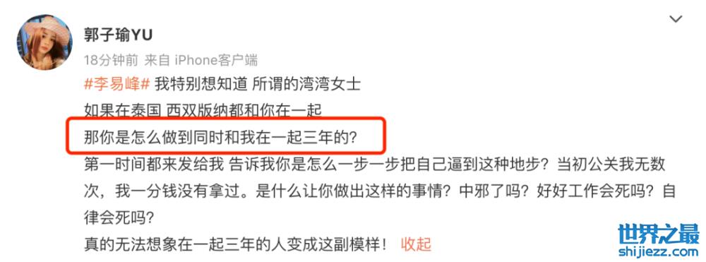 名为郭子瑜的女生发长文质问李易峰:“你是怎么做到同时跟我在一起三年的。”