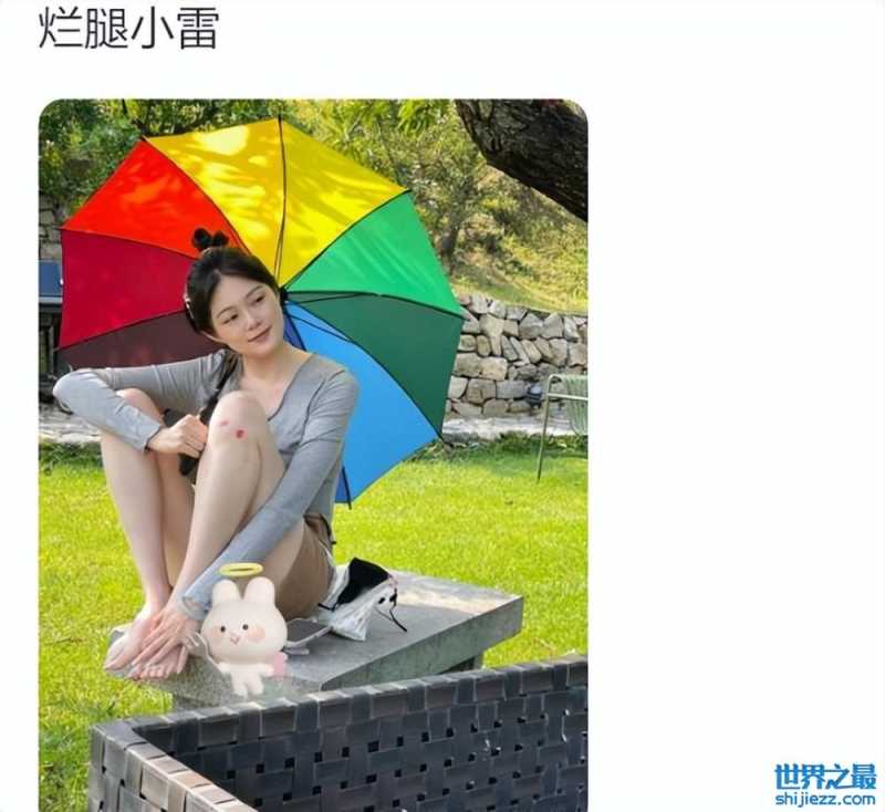 近日,晚晚在社交平台上晒出了自己的近照,并表示自己是“烂腿小雷”画面中晚晚撑着一把彩色的雨伞,光脚坐在石墩子上,穿的还是超短裤,于是她腿部的两块伤口完全被暴露了出来。