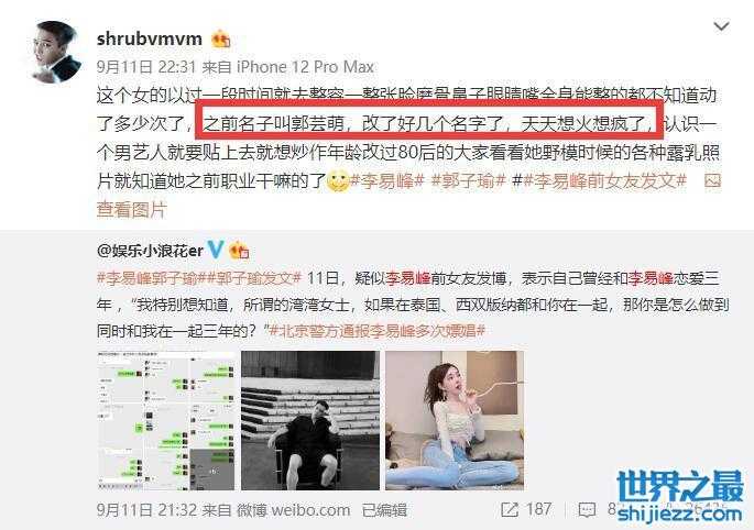 就在郭子瑜发布多条内容后,有一位自称是李易峰和郭子瑜两位共同的好友出来放锤,说郭子瑜是整容脸,动了很多次,真实名字叫郭芸萌,天天想火想疯了,称她认识一个男艺人就要贴上去炒作,改过年龄,是80后,并晒出郭子瑜野模时期的照片,让大家猜测郭子瑜之前的职业。