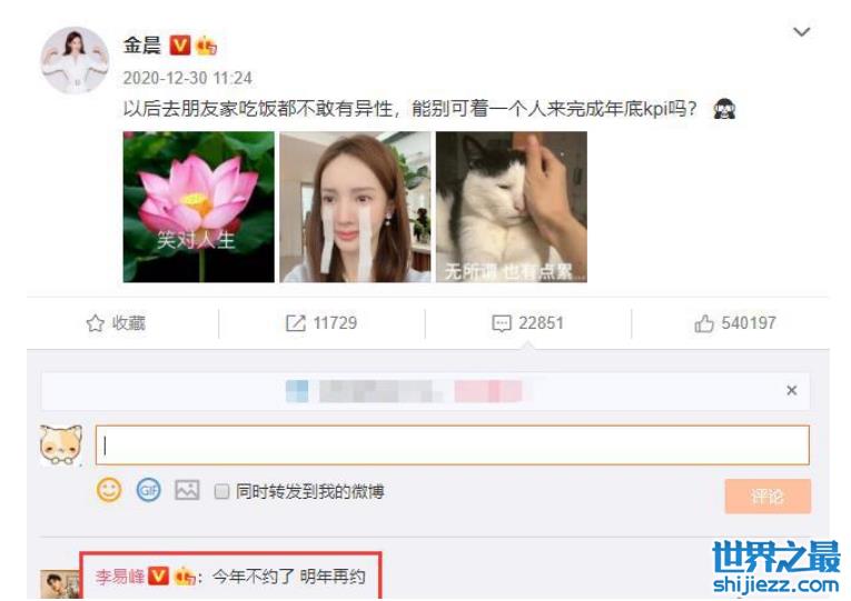 而金晨则是本人亲自发文回应说“以后去朋友家都不敢有异性,能别可着一个人来完成年底KPI吗?”当时李易峰还第一时间给她评论回应说,“今年不约了,明年再约”。