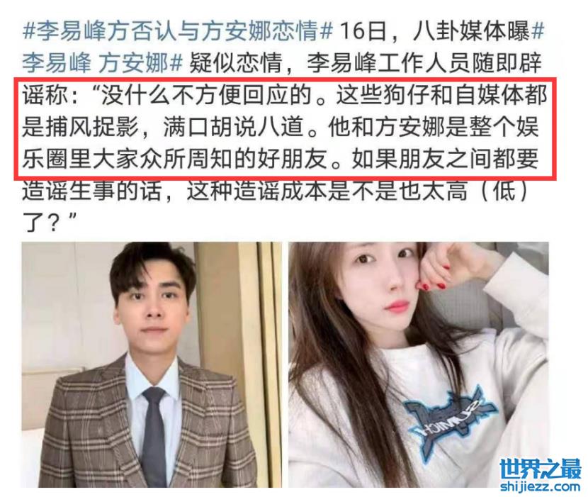 而李易峰方则是迅速辟谣,否认与方安娜的关系,称“没什么不方便回应的,他和方安娜是整个娱乐圈里众所周知的好朋友”。