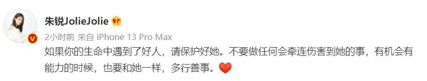另外,朱锐又写下“如果你的生命中遇到了好人,请保护好她。不要做任何会牵连伤害到她的事,有机会有能力的时候,也要和她一样,多行善事。”