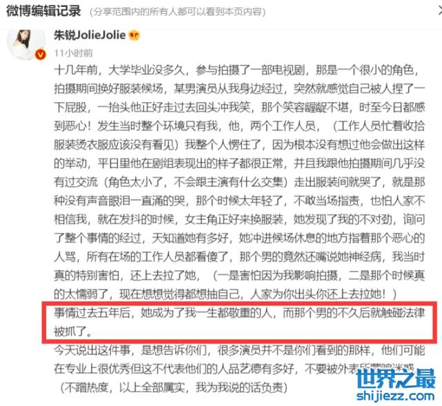 根据朱锐的讲述网友提取了重点,十几年前她大学毕业接到一个小角色,在候场时一位男演员捏了她一下屁股,她哭走走出服装间碰上了女主角,给她讲述事情经过后,女主角替她出头痛骂了男演员,五年后这位男演员因触碰红线被抓。