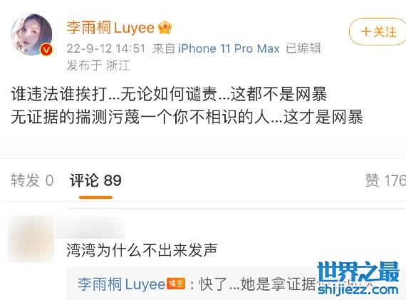 9月12日,李雨桐突然发声,表示自己的好友湾湾遭到了网暴,李雨桐还爆料说湾湾的手中有证据,也会很快站出来发声了,不过,李雨桐的发声很快遭到网友的质疑,有网友扒出李雨桐和湾湾私下是关系不错的好友,连社交圈都基本一致,两人还曾一同参加过李胜利的生日派对,所以很快有不少网友纷纷涌入李雨桐评论区,质疑她是不是在蹭热度,后续李雨桐又发声回应,表示自己站理不站人。