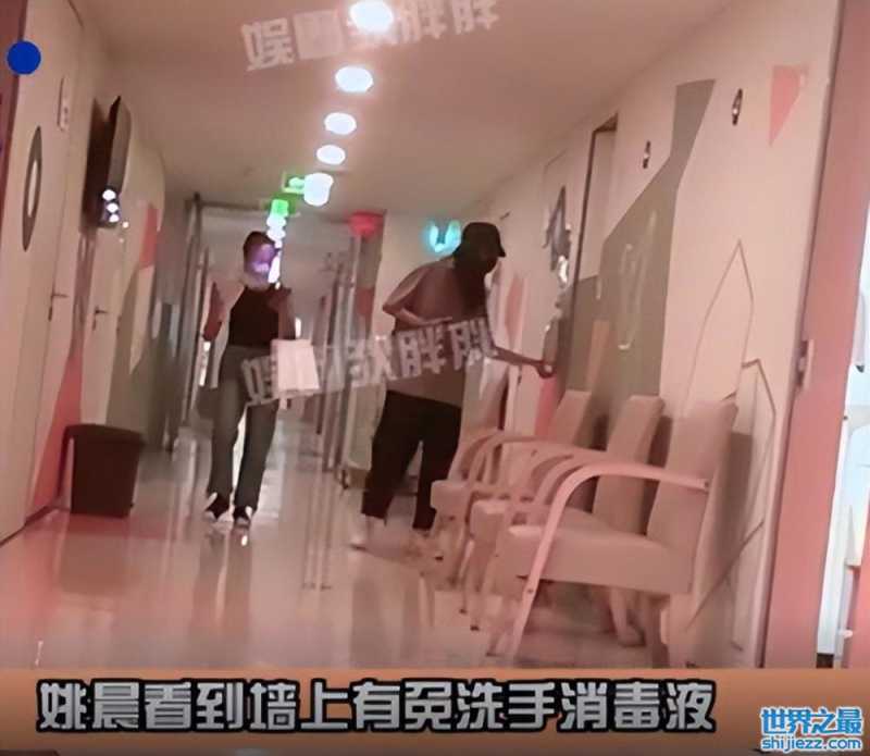 可能是疫情期间,姚晨十分注重个人卫生,在走廊看见墙上的免洗消毒液,走过去挤了两泵来给手部进行消毒,把手机放在腋下夹着,可能是觉得消毒力度不够,看到前面有消毒液,她又挤了一些继续给双手消毒。