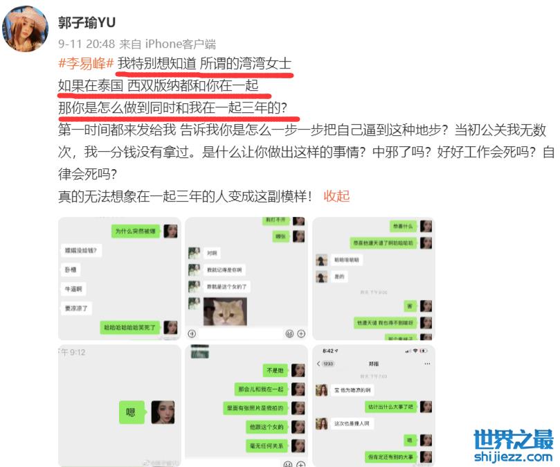 此前,李易峰被扒出疑似与网红湾湾私下关系不浅,与此同时,一位自称是李易峰前任的网红郭子瑜也在网上冒头,晒出大量与聊天记录质问李易峰有关湾湾的爆料是否属实,从这位前任的口中可以得知,她与李易峰此前交往三年之久。