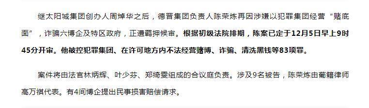 从媒体上面的消息来看,陈荣炼也是继太阳城集团周焯华之后,关于他的罪名已经确定。并且媒体称其是以涉嫌经营“赌底面”等博彩行为,构成了诈骗六博企及特区政府,正遭羁押候审。