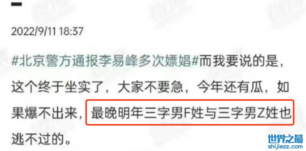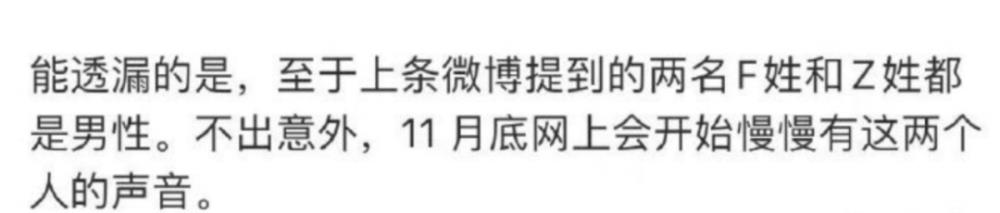 最开始爆料李易峰的博主称,11月份还会有两个大瓜,分别是“F姓艺人”和“Z姓艺人”。