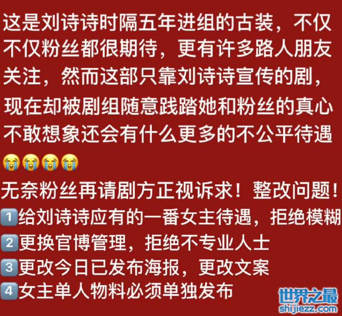 另外,在微博宣传时,刘诗诗的名字和其他人员并列,要知道之前官宣阵容之际,刘诗诗的名字是单独一行列出的,足以看出剧方前后反差之大。