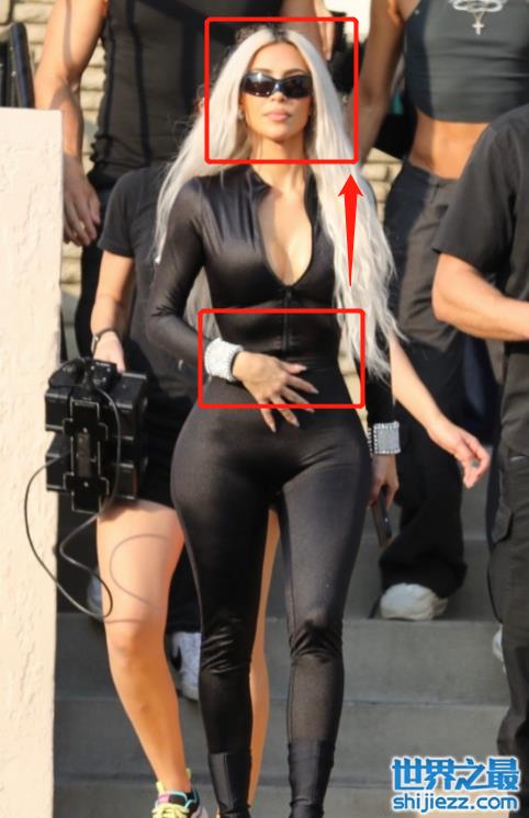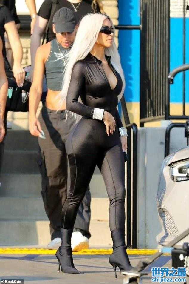 照片中可以看出,金·卡戴珊延续往日风格,穿黑色紧身连体衣,深V领口开到胸以下,戴黑色墨镜,一头白金卷曲长发披肩及腰,颇有赛博朋克的味道。