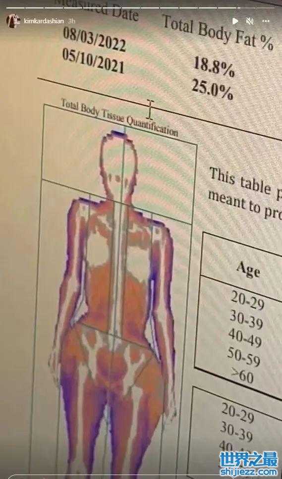 其实早前,金·卡戴珊就曾在社交平台晒出自己的体检报告,表示自己的体脂在三个月中,从25%下降到了18.8%。