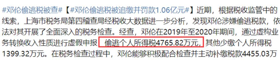 今年3月份,曾经是当红小生邓伦因为偷逃税被追缴和罚款共计1.06亿元,庞大金额令人咋舌。