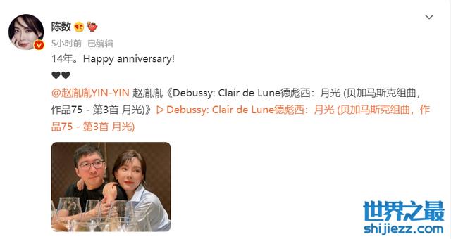 近日,演员陈数在社交平台晒出与老公赵胤胤的合影高调秀恩爱,并配文“14年,happy anniversary”艾特老公赵胤胤,引发网友热议。