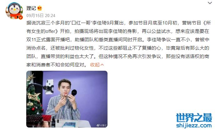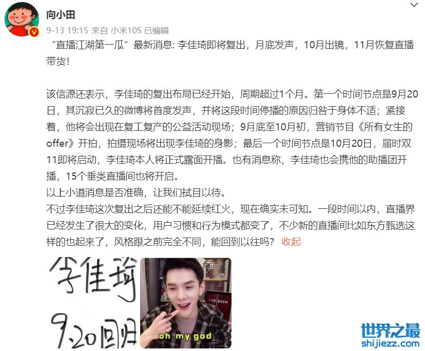 9月13日,新浪财经的专栏作家向小田发布了一条有关李佳琦的动态,他得到的消息是李佳琦将会在10月出镜,10月底双十一活动启动,李佳琦本人正式露面开播,这条动态也迅速引来不少人围观,对于不少粉丝而言,这无疑是令人喜大普奔的好消息。