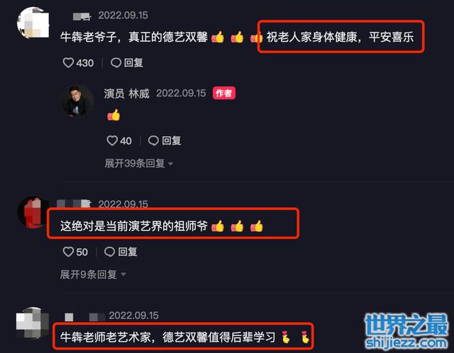 对于这则视频,网友们纷纷称赞牛犇老师是真正德艺双馨的艺术家,甚至还有人将其奉为演艺界的“祖师爷”,并祝福牛犇老师身体健康、平安喜乐的过晚年生活。