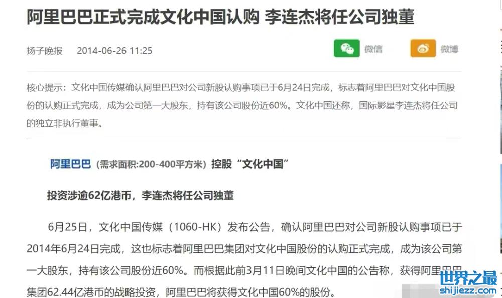除了房子和车子,李连杰还投资过公司,新闻爆出李连杰投资了阿里,担任文化中国的独立非执行董事。