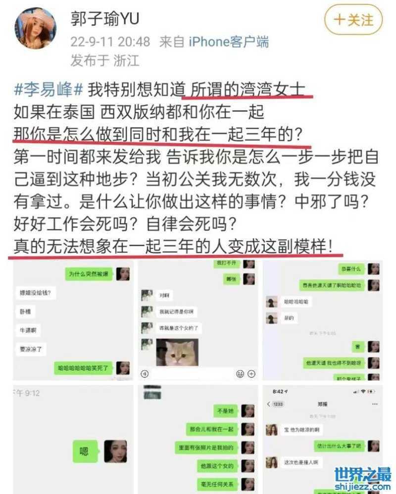 不得不说,这些截图内容真多,瓜有点大啊。事实上,这并不是郭子瑜第一次发文了,之前李易峰与网红湾湾的绯闻传开时,郭子瑜就发文回应,像是在“宣示主权”,自己才是正宫。
