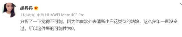 眼看着舆论愈演愈烈,起初爆料的那位网友如今话锋一转,发动态表示自己认为胡彦斌的传闻并非真实,毕竟胡彦斌一直喜欢外表清新小白花类型的姑娘,这么多年来一直没变过,所以这件事的可能性为0。