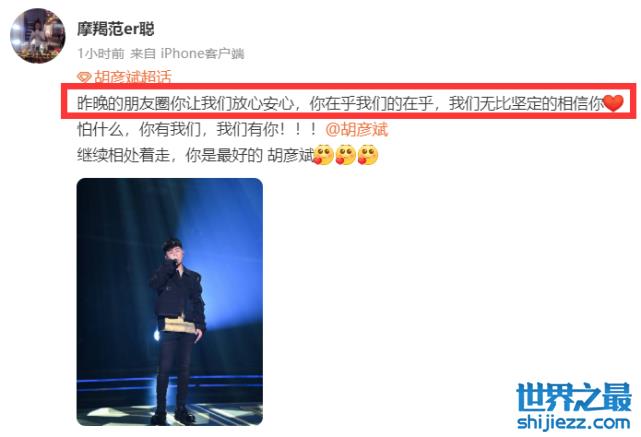 另外,还有粉丝发布动态,从中可以看出胡彦斌应该于昨晚在朋友圈发声作出回应,特意发朋友圈让广大粉丝安心,对此该粉丝表示,大家都会无比坚定的相信胡彦斌,可以看出胡彦斌与粉丝之间的关系的确很紧密,双方也是真正意义上的双向奔赴。