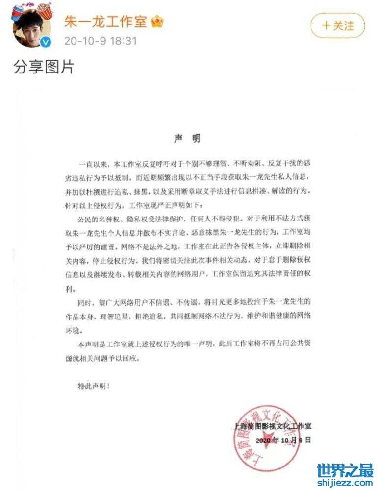 虽然朱一龙从未公开承认过有任何的女朋友,人也很是低调,没有什么绯闻传出来,还是不免被网友猜测早已隐婚生子,结婚对象还是自己的大学同学。在“隐婚生子”的舆论发酵得越来越快的时候,朱一龙工作室亲自下场发表声明,希望广大用户不传谣不信谣,也是直接否认了这个消息。