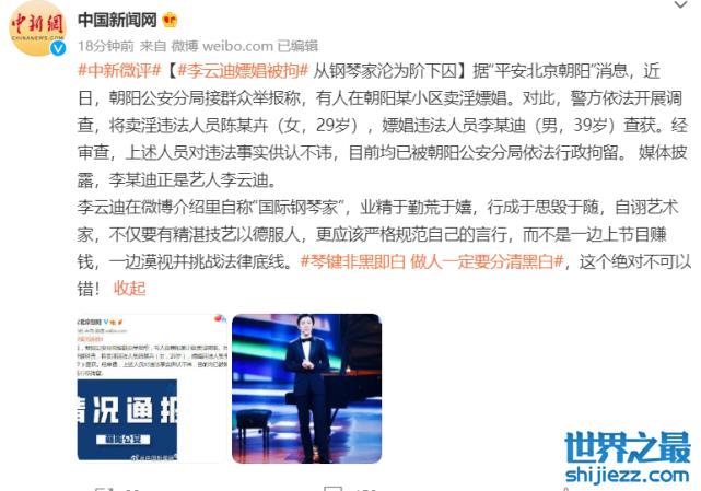 2021年10月21日,钢琴王子李云迪因涉嫌嫖娼被朝阳警方正式刑拘,女方为29岁的陈某。