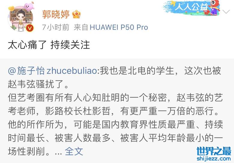 演员郭晓婷同样转发了原博动态,声称看到这样的事件自己万分心痛,也表示自己会继续关注此事。