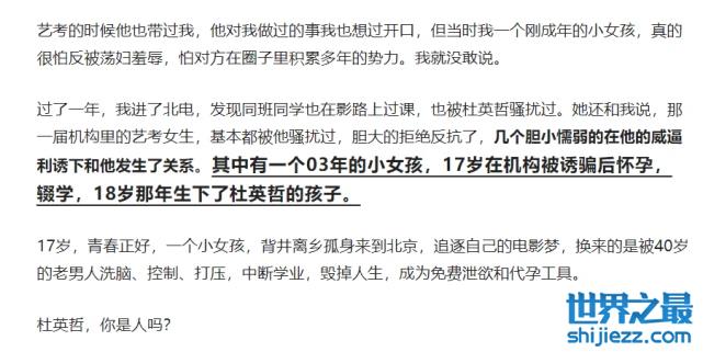 另外还有一位同样深受其害的网友发布长文讲述了自己的不堪经历,从文中可以得知,这位网友当年才16岁,在北京参加艺考培训之际不幸遇到了杜英哲,这也成为自己人生噩梦的开始。