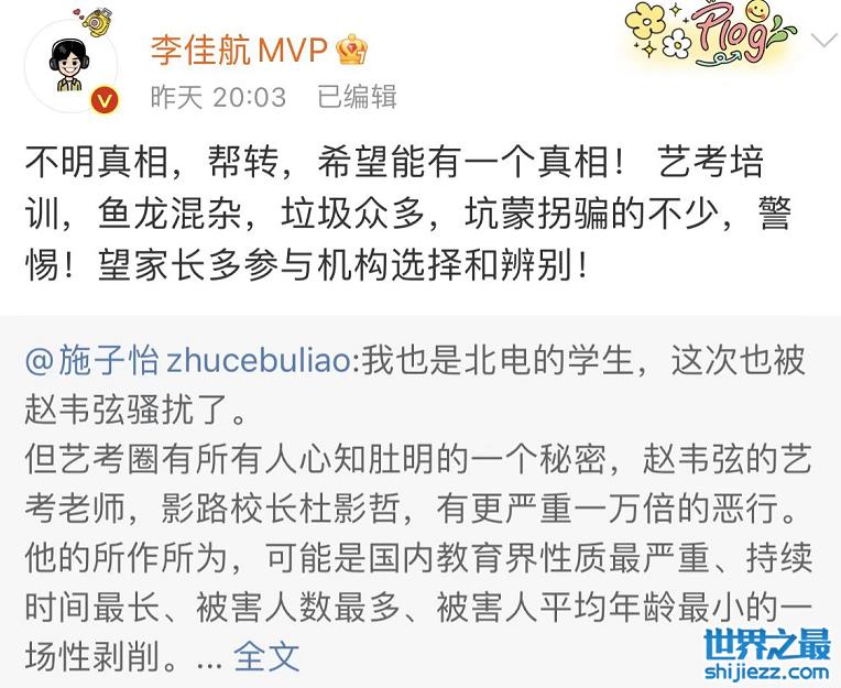 李佳航也帮忙转发了施子怡的长文动态,希望相关部门能够给大众还原真相,此外李佳航还提及了当下艺考培训的行业乱象,暖心提醒广大家长在为孩子选择艺考培训机构的时候,一定要认真辨别。