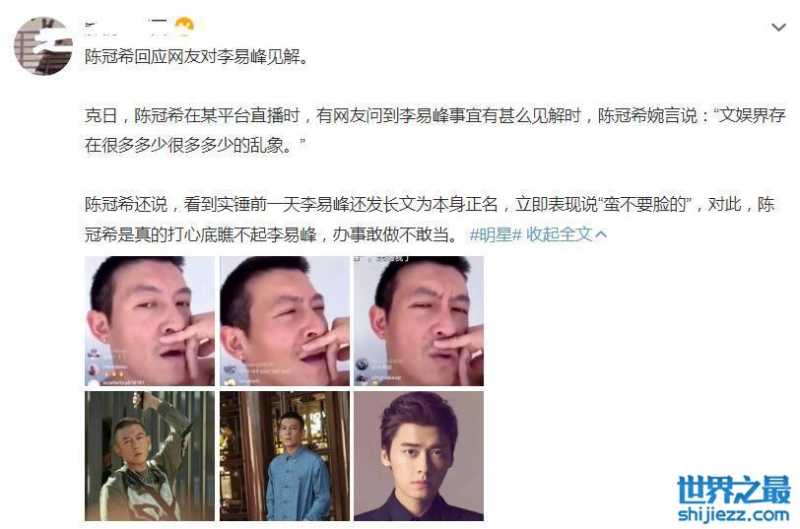 在直播间里的陈冠希说自己听说了关于李易峰的瓜,其实自己看到他有在实锤的前一天还发长文,形容李易峰其实是蛮不要脸的。