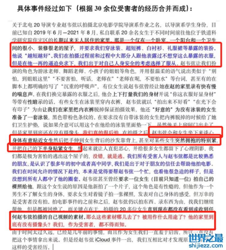 在9月16日,有消息爆出北电导演系赵韦弦利用拍摄导演系作业的名义,联系了20多名女生前往他的家中,而他要求这些女生穿着暴露,有意无意地用身体去触碰女生的身体。