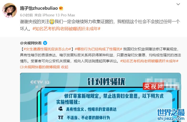 此外,央视就女生遭遇性骚扰的社会问题更新动态,其中特别强调当女生遭遇性骚扰后应当向公安机关报案,或提起民事诉讼,而施子怡随后也转发了央视的动态,对央视的关注也给予诚挚感谢,并表示接下来大家会继续搜集相关证据,自己也相信这个社会不会放过任何一个坏人。