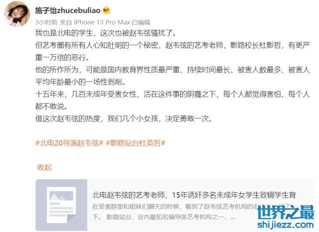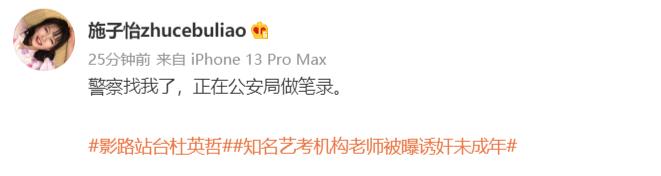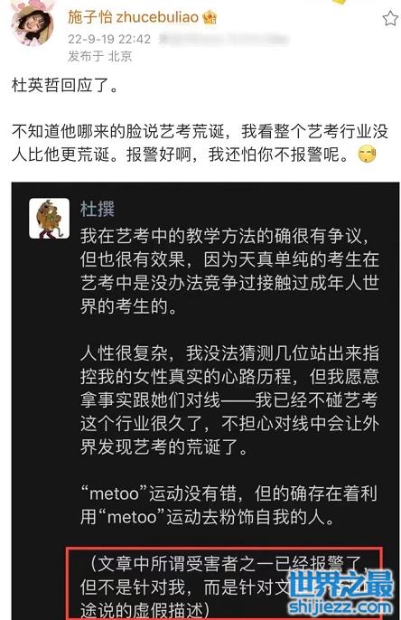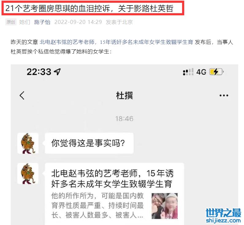9月19号,名叫施子怡的女博主在网络上发布长文,控诉艺考机构影路站台的校长杜英哲,而杜英哲恰好也是赵韦弦的老师,从文中可以得知,杜英哲比起赵韦弦可谓有过之而无不及,爆料称他曾假借艺考培训的名义向多名女生实施性骚扰,其中一位17岁的女生还怀上杜英哲的孩子,最终这位女生被迫退学生下了杜英哲的孩子,本应该大好的前程就这样全毁掉了。