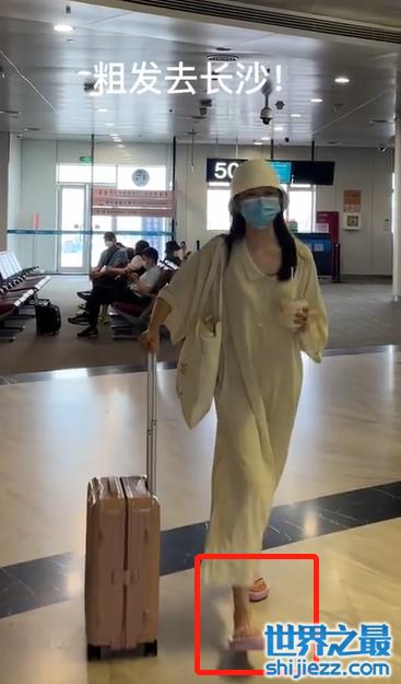 视频中可以看出,晚晚出发当天穿白色针织长裙,带一顶白色渔夫帽,背上帆布包,低调而不失温婉。虽然一身素净白色,但晚晚脚下搭配了一双粉色的厚底拖鞋,真是足够吸睛。