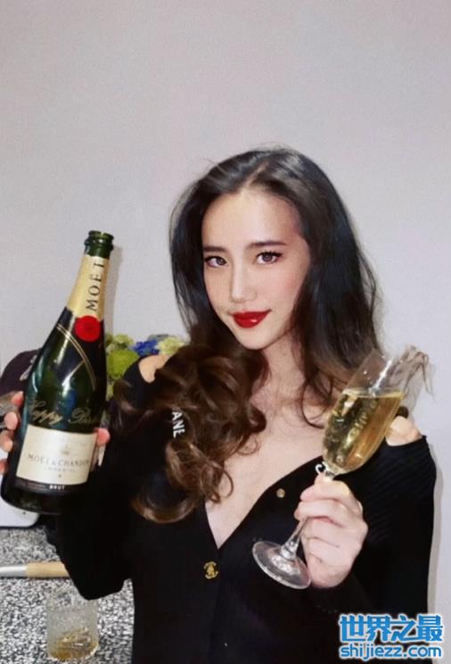 当日骆欣言穿着低领露肩纯黑色外套,大方秀出精致的白皙锁骨,涂着大红唇妆容艳丽,卷发披肩气质妩媚性感。只见骆欣言一首握着香槟酒,一手端着香槟酒杯,面对镜头自信大方的微笑,眼神风情。