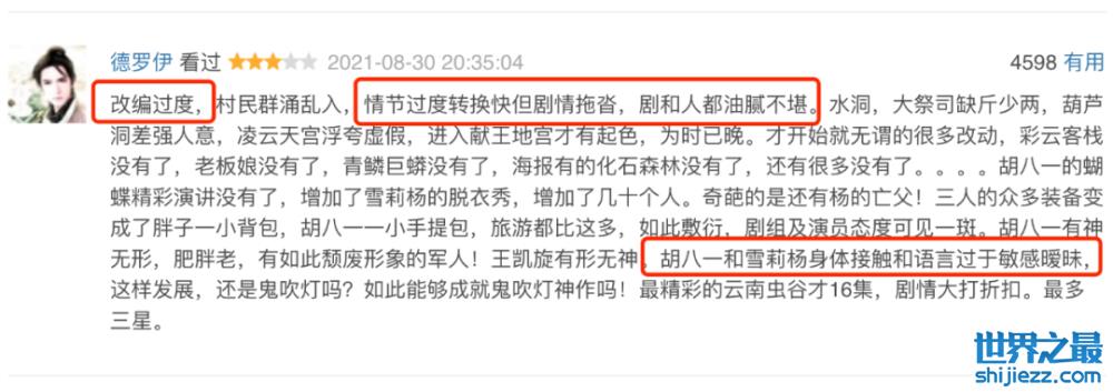 到了《云南虫谷》,观众的期待值被拔高,点进去看却发现,原著被魔改,加了一些无关紧要的剧情和角色,三人组的戏份被削弱。