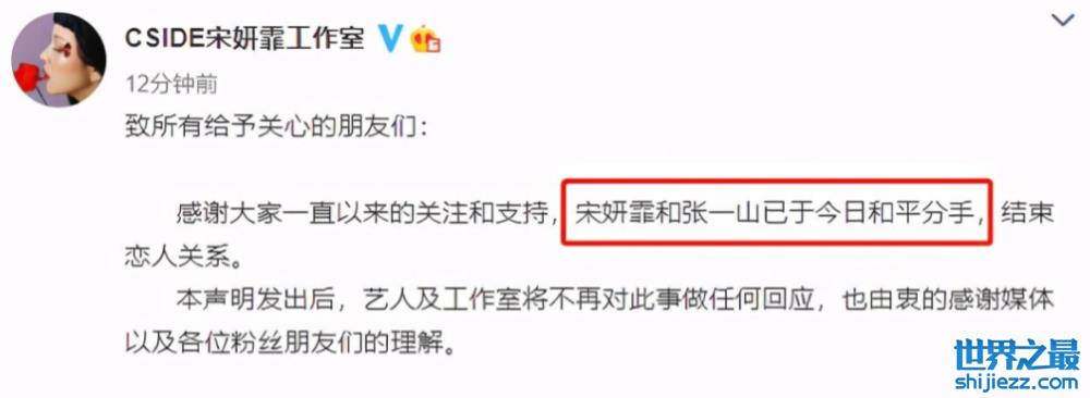 再后来张一山被拍到和美女亲密出游,宋妍霏得知消息后当天就果断发表分手声明。不过女方发布的分手声明张一山也没有任何回应,因此有说法是认为张一山对待感情不忠。