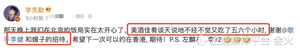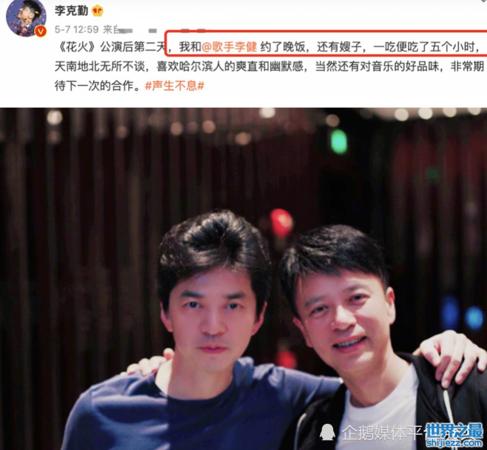 其实这也不是李克勤和李健第一次聚餐,早在今年5月份,两人在音乐节目《生生不息》中有了初次合作,共同演绎了一首《花火》。公演结束之后,李克勤和李健夫妇相约晚饭,还称赞李健为人爽直幽默,并且对音乐有极好的品味,两人也算是互遇知音了。