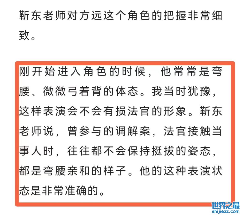 比如,在调解时,方远会经常弯腰,微微弓着背,而导演觉得这样的体态是不是有损法官的形象,但靳东说,在调解时,法官接触当事人,都不会挺直身体,而是弯腰表示亲和。导演也大赞他这种表演状态非常准确。