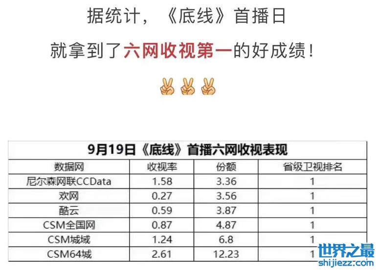 而在其他数据平台,《底线》成绩也是不俗,猫眼热度第一,V榜电视剧第一,六网收视率第一!