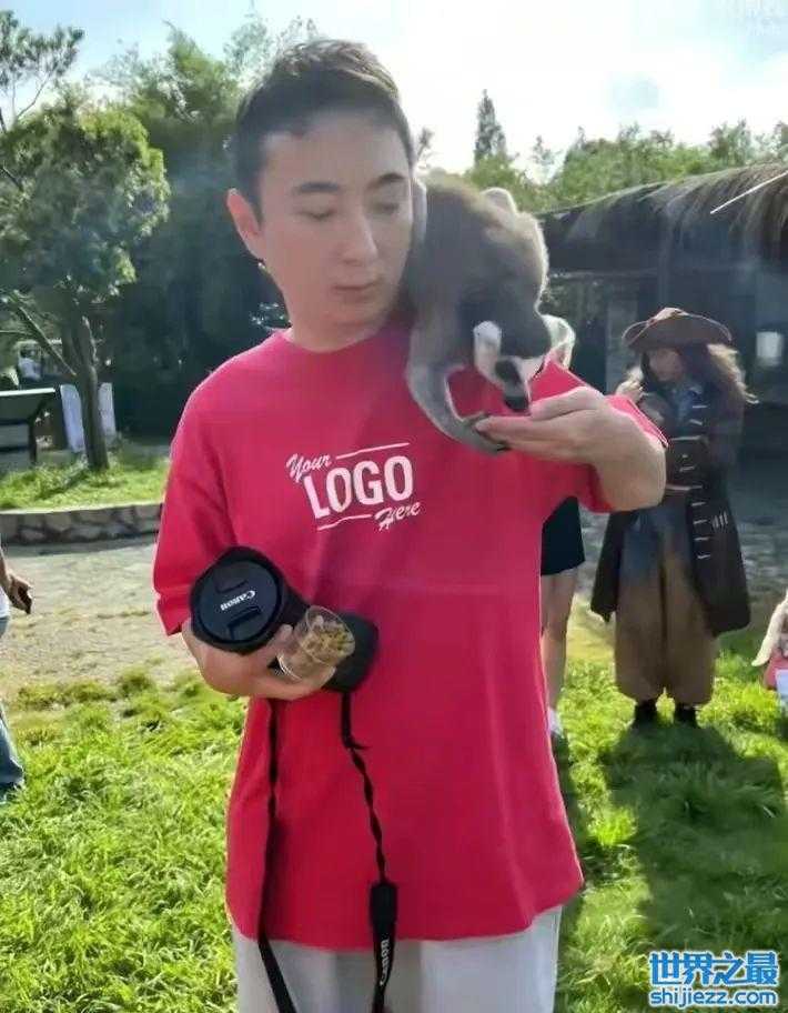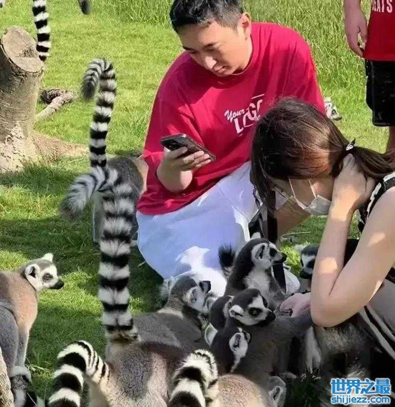 除了毫无包袱地把环尾狐猴放在脖子上,王思聪还亲手喂食,还挺有爱心的。