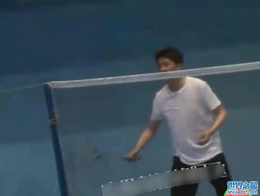 冯绍峰打羽毛球的动作十分标准,挥洒自如,但体力却没有跟上,才打了一会儿,就体力不支,只好停下来喝水补给。
