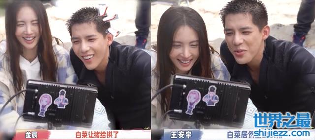 拍摄结束后,金晨和王安宇靠在一起看监视器的回放,金晨直接表示白菜让猪给拱了,而王安宇更是调侃道,白菜竟然拱猪,俩人的神奇对话引得在场工作人员哈哈大笑。