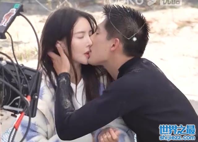 随后导演一声“准备亲她”,男主靠近女主,拥住女主下巴,深情一吻,而女主则是有些猝不及防,但很快两人在沙滩开始缠绵。