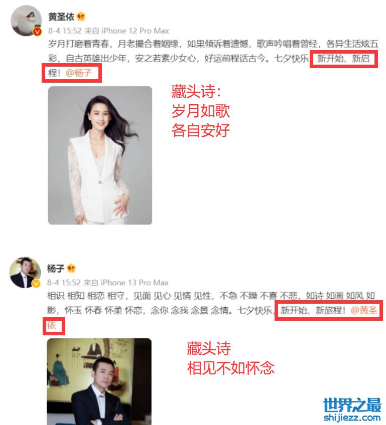 当时就有网友表示,这突然乱入的藏头诗看上去与两人之前风格大不相同,黄圣依七夕当天的文案更是让人不得其解,文中还提到了“新开始,新征程”的相关字眼,如今有网友解读黄圣依发布的文案实际是藏头诗,寓意:“岁月如歌,各自安好”,怎么看怎么像是官宣分手的用词。