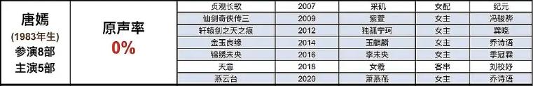 网友统计的表格里,鞠婧祎是年龄最小的女星,可原声率0%的成绩,倒是跟前辈们一样,甚至有青出于蓝的迹象。鞠婧祎播出的6部古装女主剧,无一例外全是配音。