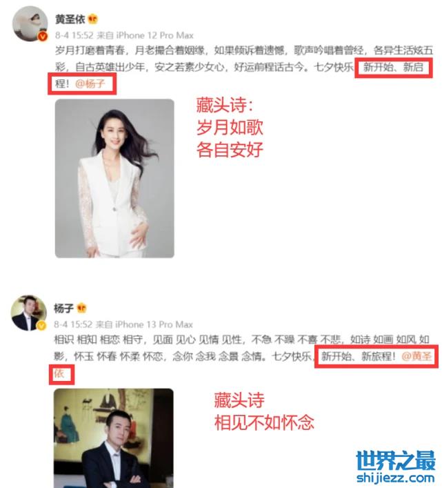 9月23日,有网友爆料黄圣依的婚姻疑似亮了红灯,她在七夕节这天,与杨子同时发文并艾特对方,经过网友解读,发现两人的文案疑似是“藏头诗”:岁月如歌,各自安好,相见不如怀念,这样的文案怎么看都像是分手的用词,因此引发外界热议。