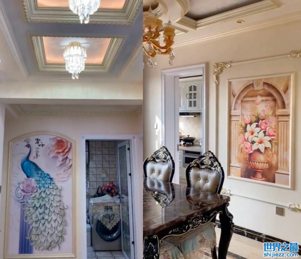 还有一些华丽的大壁画,以及椅子上随处可见的蕾丝坐垫,还有墙壁上镶嵌的一些花纹,整体家具都是欧美复古风,地板桌子干净到反光。各种细节也都透露出陈萌一家人的高要求、高眼光,对生活的高品质追求。