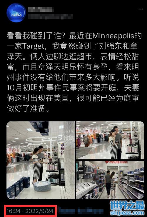 9月24日,有网友发文称在美国明尼阿波利斯市的一家超市偶遇到刘强东和章泽天,直言两人边聊边逛表情轻松甜蜜,偶遇者还爆料说章泽天明显怀有身孕,看起来之前的事件并没有给他们带来多大影响。