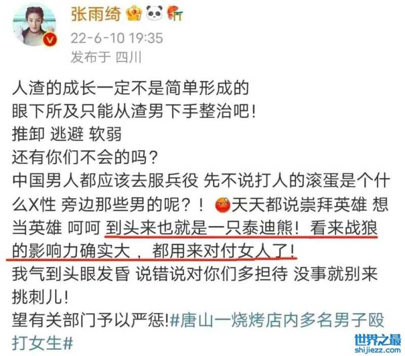 张雨绮在大家心目中,一直是一个心直口快的直爽形象。她本人之前非常爱发声,不过有些话因为没有深思熟虑就说出口,常常导致“祸从口出”。比如某件大家都很关注的某个社会案件中,张雨绮把男人称作“泰迪熊”,就连战狼也无辜被提到,引起网友们的愤怒。