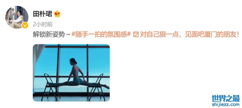 在田朴珺的社交动态中,健身对于她而言早已经成为了家常便饭,几乎每隔一段时间,大家就能够看到她“解锁新姿势”,论身材柔韧性和体能,她已经超出了很多的同龄人。